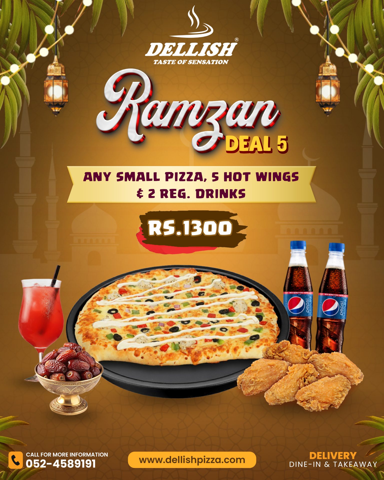 Pick any Small Pizza with 5 Hot Wings and 2 Drinks.